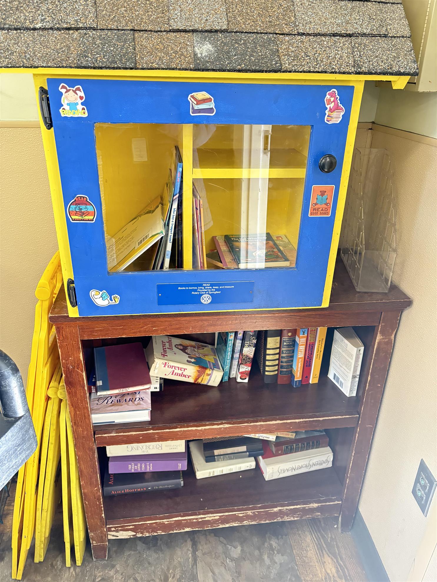 The Rotary Micro pantry is located on the east side of the building by the main entrance. It is a purple and yellow cabinet.